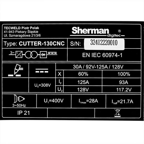 125A Przecinarka plazmowa CUTTER 130CNC + manual do stołów i ploterów CNC z możliwością cięcia ręcznego SHERMAN (TEC0236)