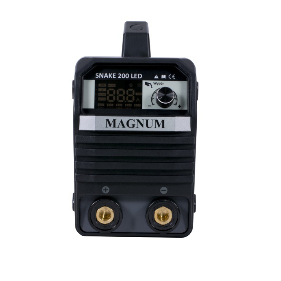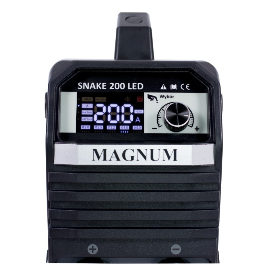 Urządzenie SNAKE 200 LED marki MAGNUM jest lekkim, przenośnym źródłem energii wykonanym w technologii inwertorowej. Urządzenie zasilane jest z sieci jednofazowej 230V, posiada maksymalny prąd spawania 200A oraz wysoką 60% sprawność. SNAKE 200 LED wyposażony jest w duży multifunkcyjny wyświetlacz LED z intuicyjnym, łatwym w obsłudze panelu sterowania. Urządzenia oparte jest na zaawansowanej technologii, wykorzystującej tranzystory IGBT co przekłada się na zmniejszenie zakłóceń elektromagnetycznych, małe straty mocy, zwiększenie wydajności i niezawodności źródła prądu oraz mniejsze zużycie energii. Urządzenie wyposażone jest w funkcję HOT START, ARC FORCE, ANTI STICK, VRD. Dzięki temu zajarzanie łuku i prowadzenie elektrody jest niezwykłe łatwe, nawet dla spawaczy bez żadnego doświadczenia.