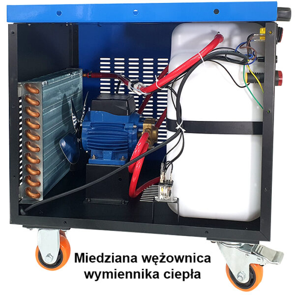 Chłodnica WRC 600A2 ALARM to w pełni profesjonalne urządzenie przeznaczone do chłodzenia cieczą uchwytów spawalniczych MIG/MAG i TIG oraz innych podzespołów i urządzeń wymagających chłodzenia w obiegu zamkniętym. Model WRC 600A2 ALARM dzięki dużej zdolności chłodzenia jest szczególnie polecany do chłodzenia dużych zgrzewarek oraz dużych stanowisk spawalniczych, które mogą zawierać nawet kilka urządzeń chłodzonych cieczą. Chłodnica przystosowana jest do pracy ciągłej. Charakteryzuje się prostą i zwartą konstrukcją. Zastosowanie wymiennika ciepła zbudowanego na miedzianej wężownicy zdecydowanie zwiększa skuteczność chłodzenia oraz przedłuża żywotność urządzenia. Chłodnica wyposażona jest w czujnik przepływu z alarmem wizualnym oraz dźwiękowym. Czujnik przepływu uaktywnia alarm w momencie braku przepływu czynnika chłodzącego spowodowanego niedrożnością przewodów wodnych, otwartym obiegiem płynu lub jego zbyt niskim stanem w chłodnicy. Usunięcie przyczyny alarmu powoduje jego automatyczne wyłączenie.